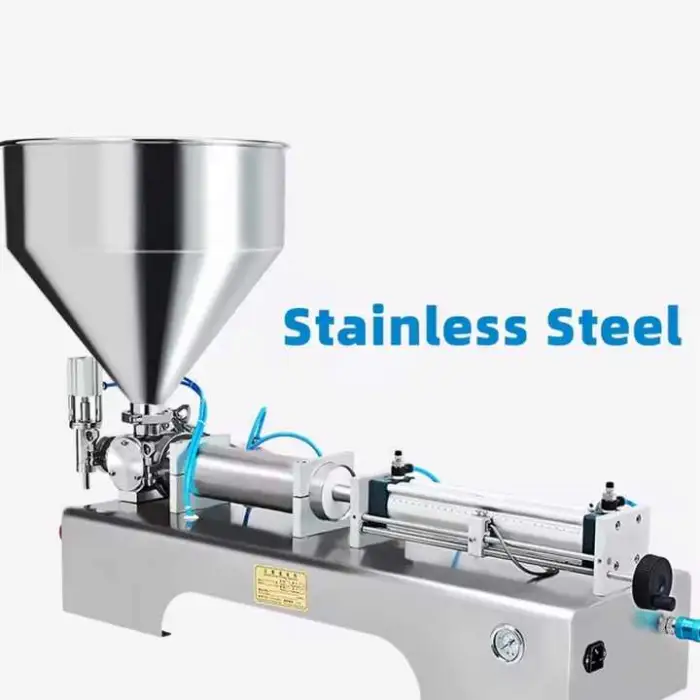 The machine can fill a variety of products including cosmetic creams, lotions, food items like jams and sauces, viscous liquids such as honey and peanut butter, as well as chemical substances and paints.