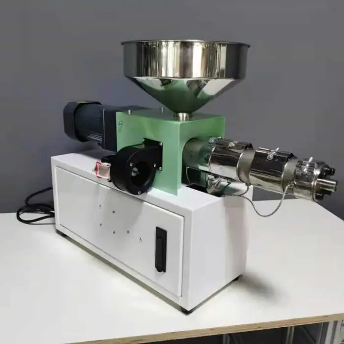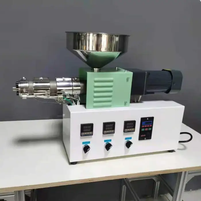A single screw desktop laboratory extruder is a compact and efficient machine used for processing thermoplastic materials, allowing users to melt, mix, and form plastic into specific shapes or products.
