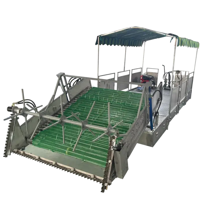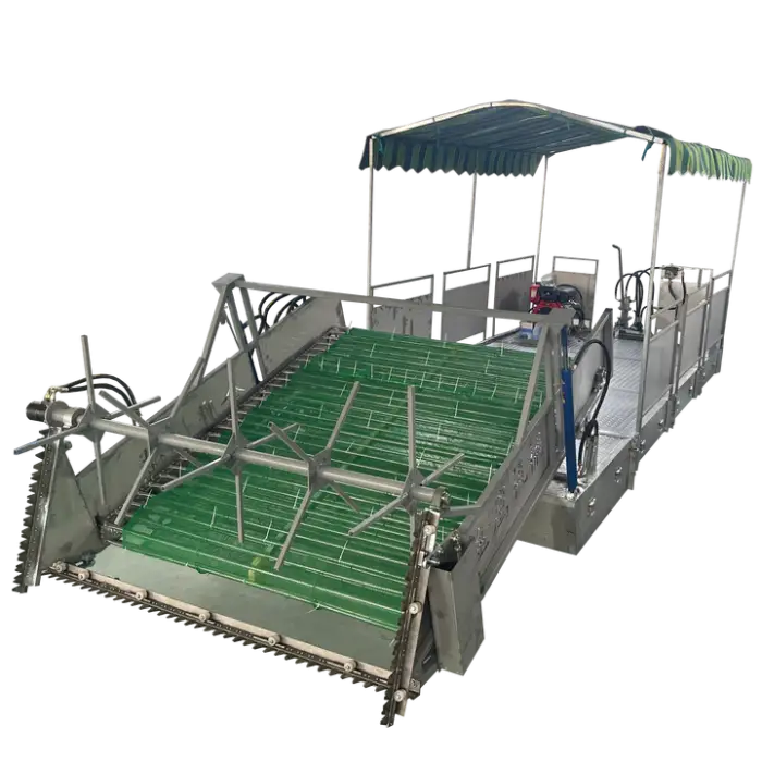 The electric and hydraulic drive system provides smooth operation and efficient power management, allowing the machine to navigate and collect aquatic plants effectively in various water conditions.