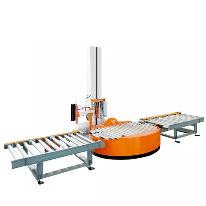 The Smart Robot Portable Fully Automatic Conveyor Belt Mobile Turntable Film Pre Stretching Pallet Stretch Wrapping Machine can wrap various packaging materials including plastic, paper, and wood.