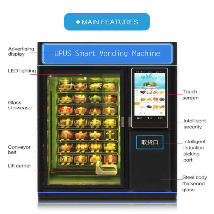 The machine runs an Android-based system with a 21.5-inch interactive touch screen. The advertising screen supports a customizable UI to display promotions and product information.