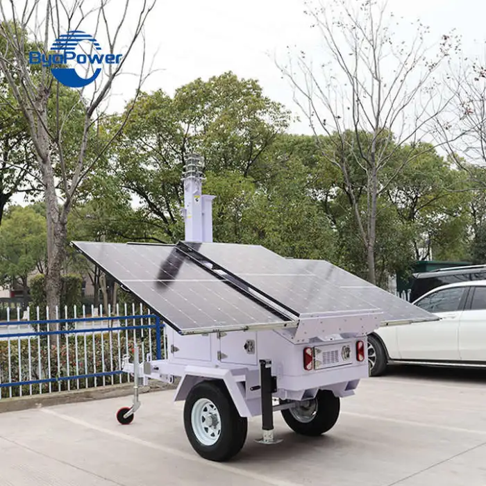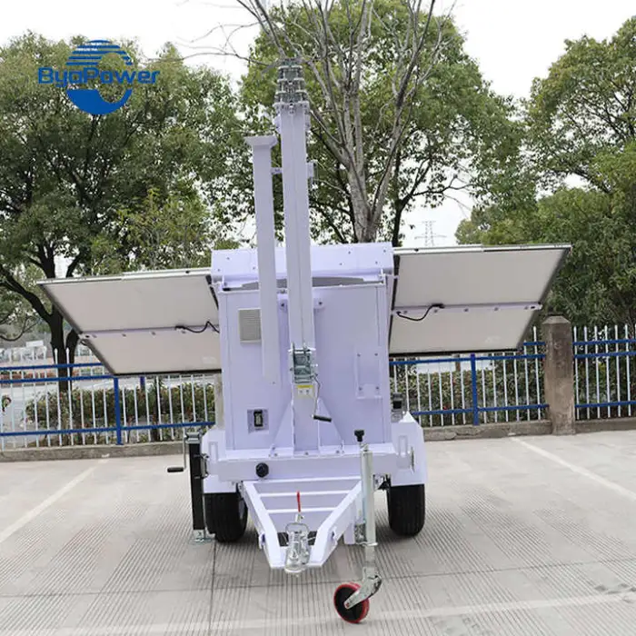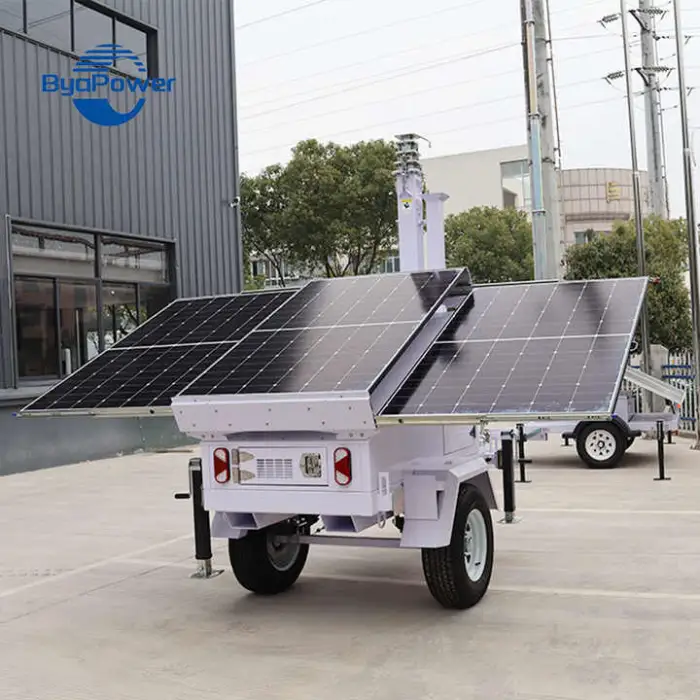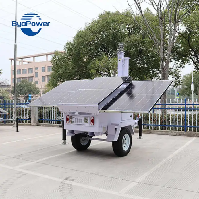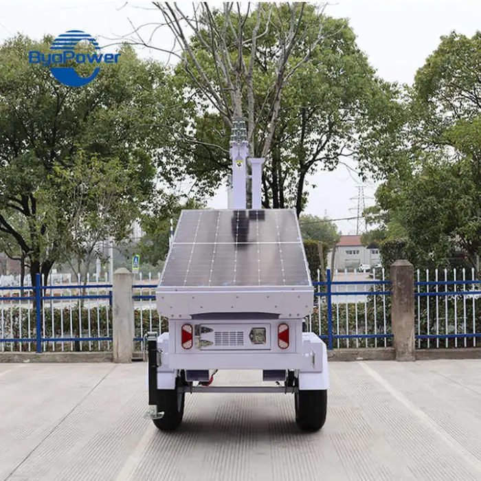 It is a portable solar-powered trailer system from ByaPower (model BY2P) that combines a solar generator, built-in/removable batteries and an LED lighting tower to provide clean, temporary or emergency electrical power and illumination for outdoor applications.