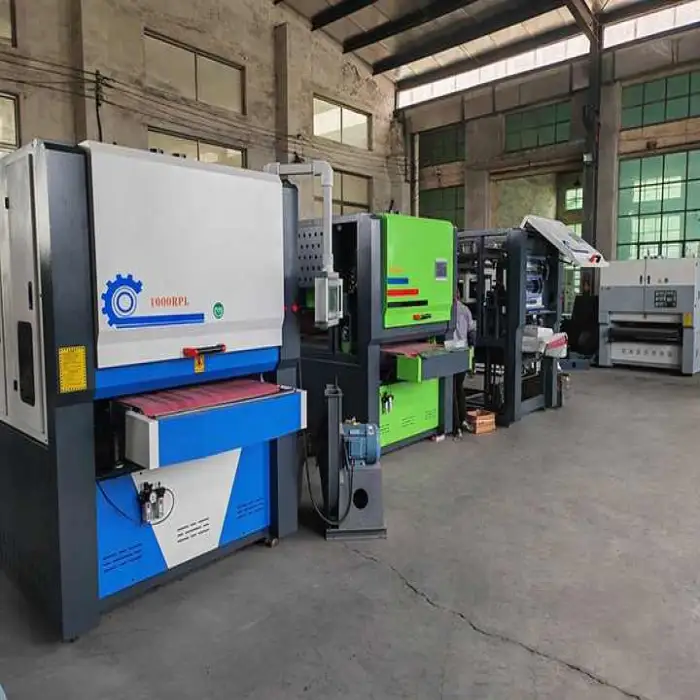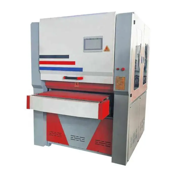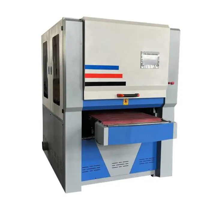 The machine uses an 820×1820 mm abrasive belt. Belt life depends on material, feed speed, and finish required; inspect belts regularly and replace when worn, torn, or when finish quality degrades. Keep spares on hand for high-volume shops.