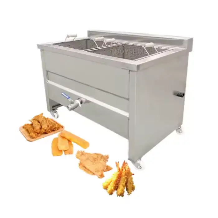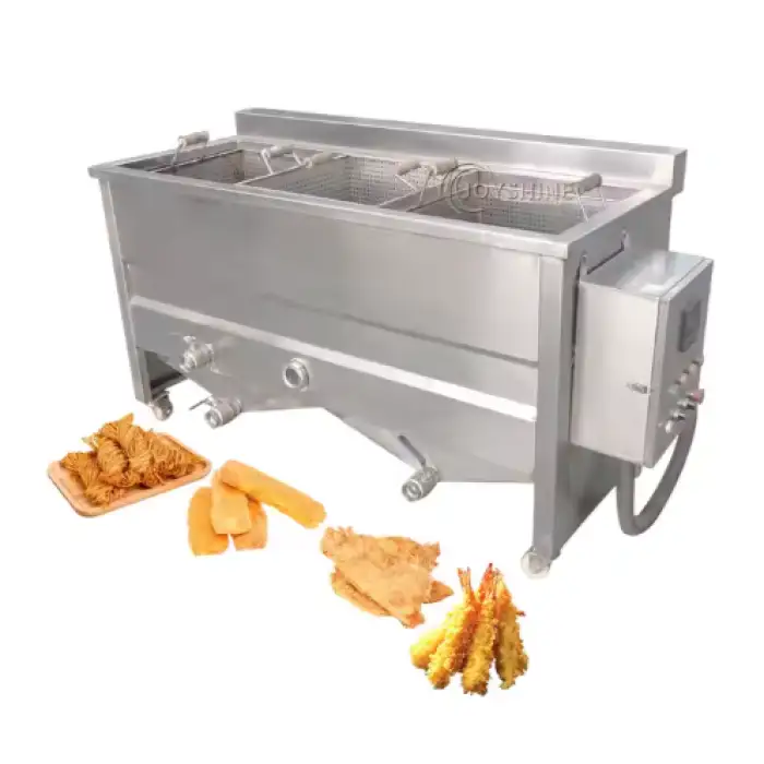 Use heat-resistant gloves and splash protection, never add water to hot oil, monitor oil temperature, drain and cool oil before maintenance, check gas connections for leaks (if applicable), ensure emergency shut-off accessibility, and train staff on safe frying procedures and first-aid for burns.