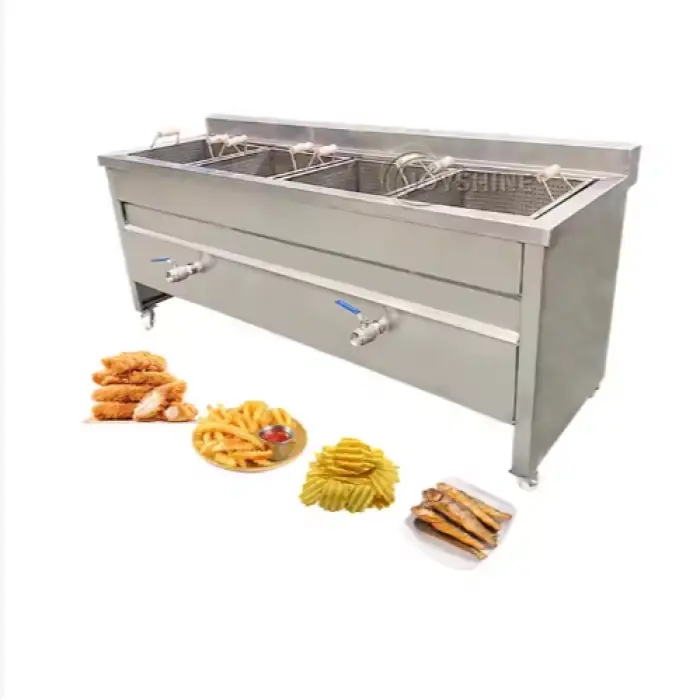 It has two independent tanks and four baskets. Tanks and baskets can be used simultaneously, allowing you to cook different products or stagger batches for continuous output.