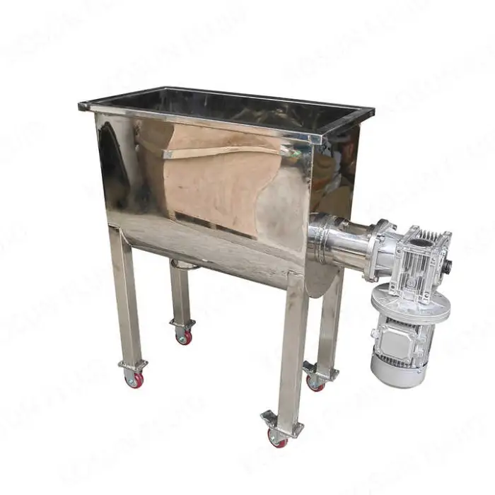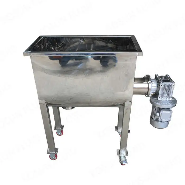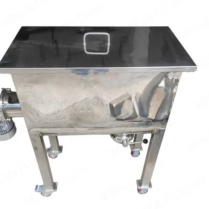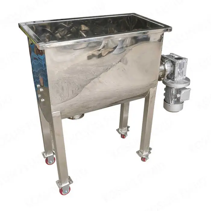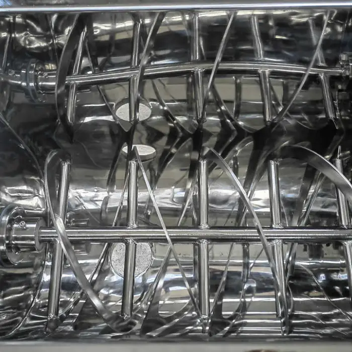 This ribbon/paddle blender is designed primarily for dry powders and low‑moisture blends. It is not intended for high‑viscosity pastes or heavy liquid mixing unless specially configured.