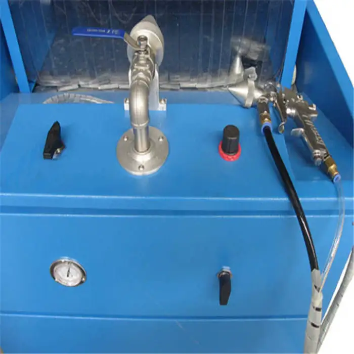 Check air supply and pneumatic pressure (0.8 MPa), verify fluid/emulsion level and mixture, inspect pump and seals for wear, clear or replace clogged nozzles, check for hose leaks, and review PLC error codes or test report diagnostics.