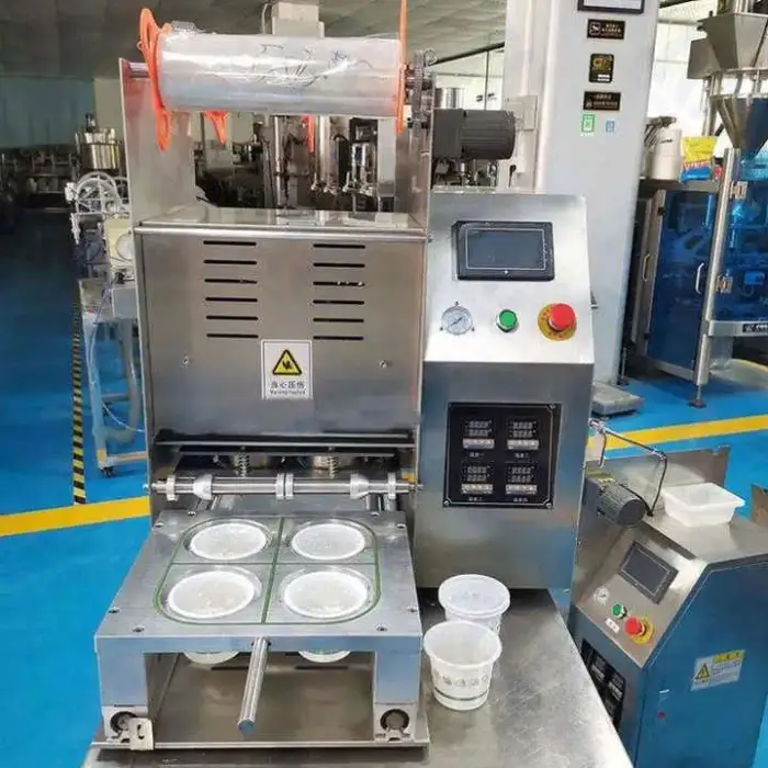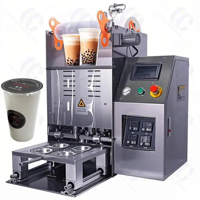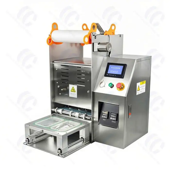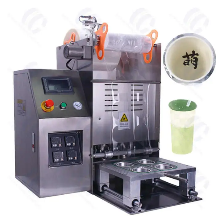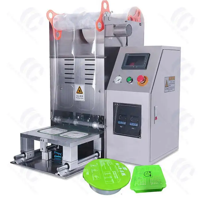 This semi-automatic tabletop machine seals cups, trays and boxes using heat and vacuum sealing to preserve snacks, beverages (coffee, milk tea), yogurts and other prepared foods. It's designed for cafés, restaurants, food stalls and home use for faster, more hygienic packaging.