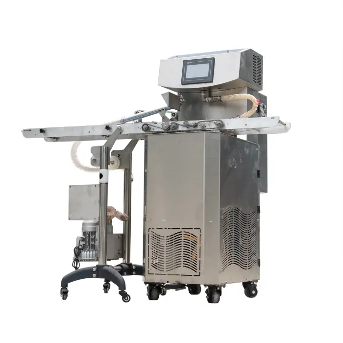This machine is ideal for chocolate coating candies and confections, baking applications for cake decoration, snack food production lines, commercial catering services, and chocolate process factories.