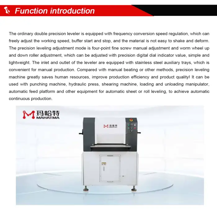 The machine is ideal for industrial applications requiring precision leveling and is suitable for workshop environments needing reliable metal handling.