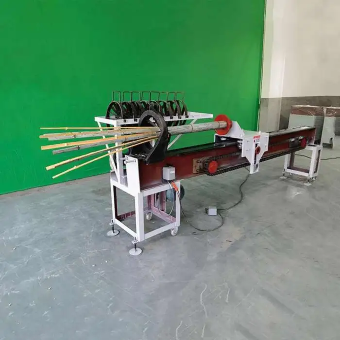 The machine accepts bamboo and suitable wood raw materials. For best results use straight, clean bamboo/wood; your supplier can advise on dimensions and condition for optimal operation.