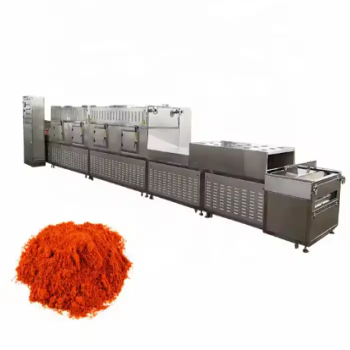 It uses microwave dielectric heating to rapidly dry and sterilize powdered spices (paprika, cumin, pepper, oregano, etc.), reducing microbial load and extending shelf life while maintaining product quality.