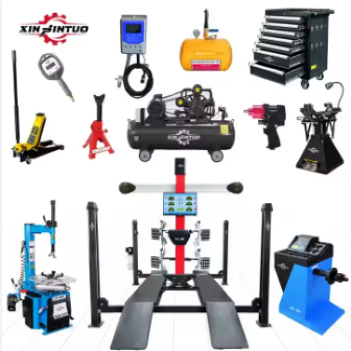The combo includes a tire changer, wheel balancer, and wheel alignment equipment, along with various additional tools such as a tire spreader, bead blaster, and air compressor.