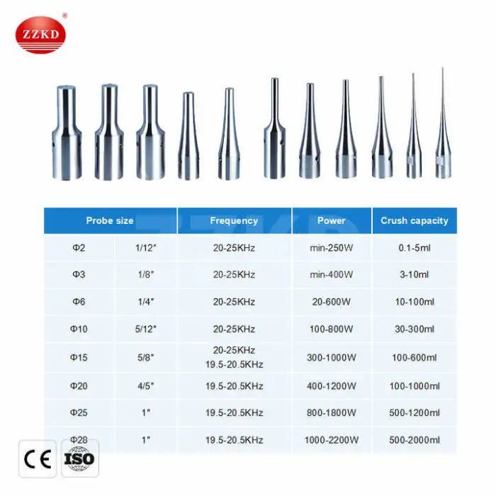 The Ultrasonic Homogenizer Sonicator offers optional probe sizes of 2, 3, 6, 8, and 10 mm.