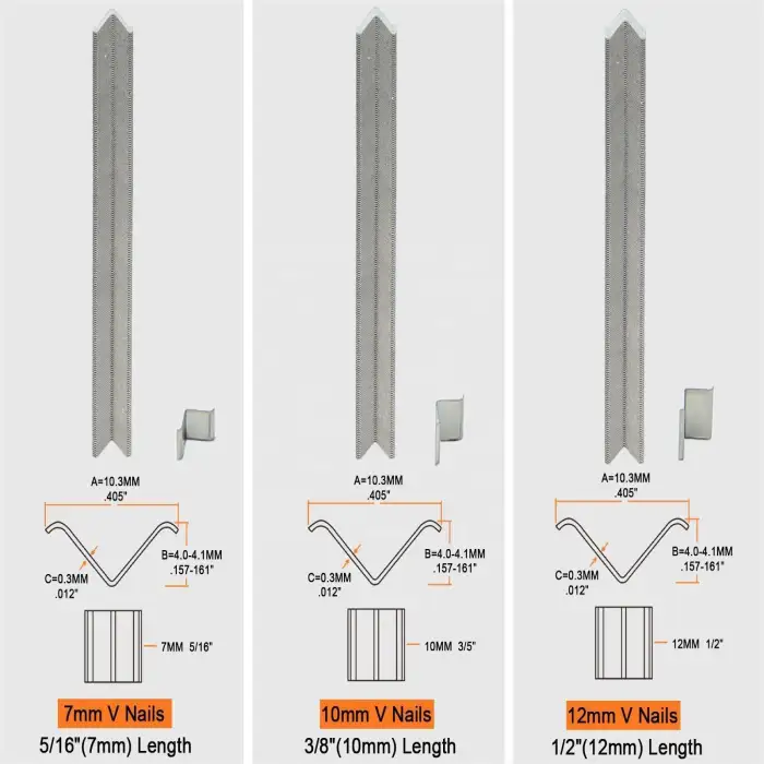 The V Nail Making Machine is designed to produce V nails in sizes of 7mm, 10mm, and 12mm.