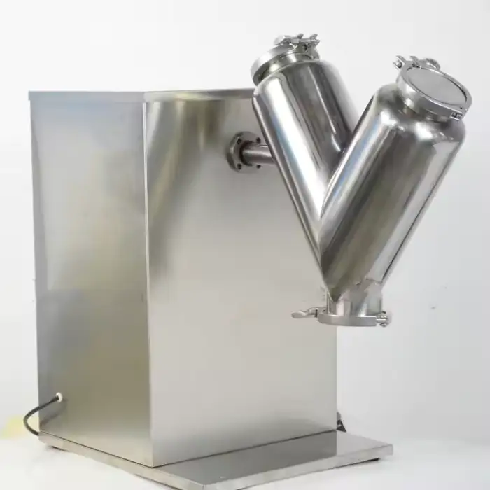 The V Type Blender Mixer is available in capacities of 20L, 50L, 100L, and 1000L.