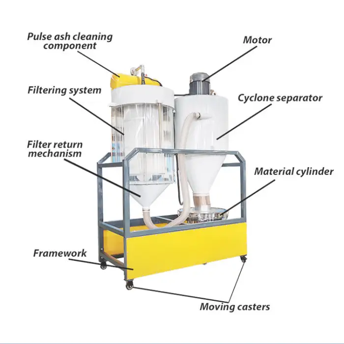 The dust collector uses a filter bag for effective dust filtration.