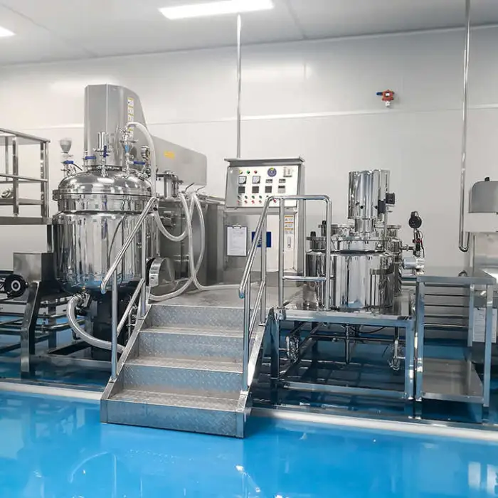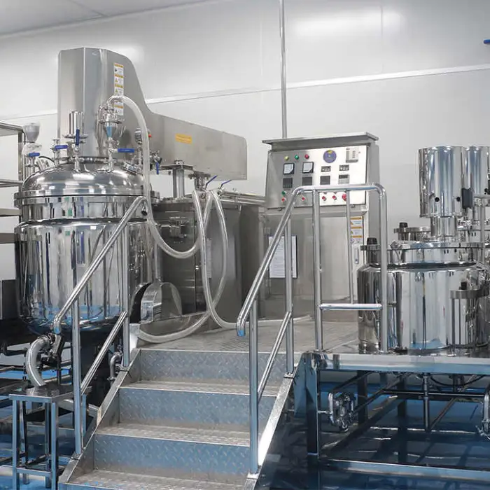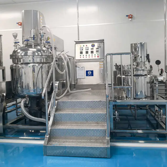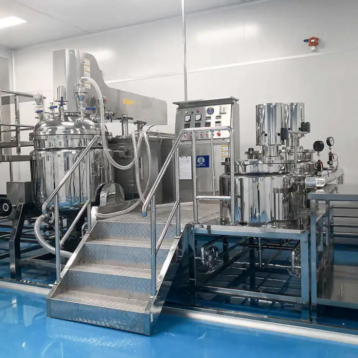 A Vacuum Emulsifier Machine is a specialized mixer used in cosmetics production that combines and emulsifies ingredients to create smooth and uniform beauty products, such as creams and lotions.