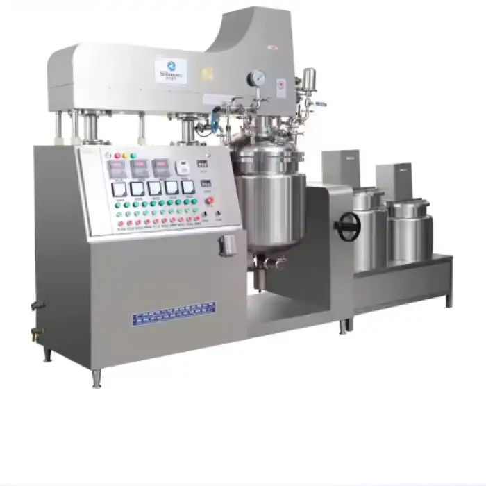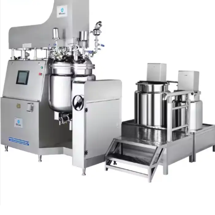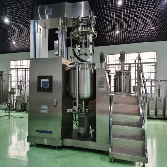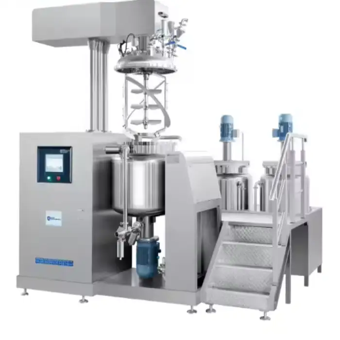 The vacuum system removes air and gases during mixing to prevent oxidation, reduce bubbles, improve texture and stability, and enhance product appearance—particularly important for creams, lotions and high-quality emulsions.