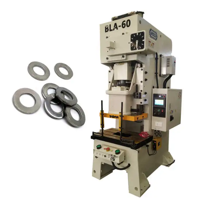 The machine has a rated capacity of up to 200 pieces per minute. Actual output depends on washer size, material type and thickness, and selected tooling.