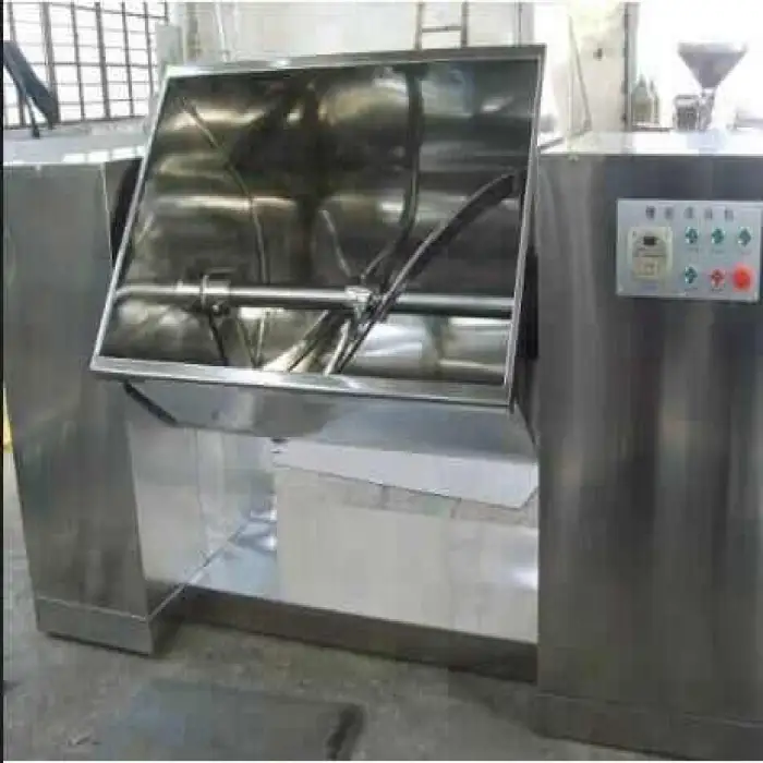 The unit is a ribbon-style blender that uses inner and outer helical ribbons to move material radially and axially for fast, uniform mixing. (If you need clarification on the exact internal configuration, the supplier can confirm technical drawings.)