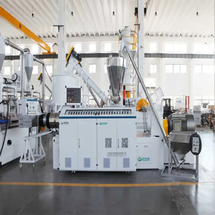 The machine utilizes a double-screw design, which enhances processing efficiency.