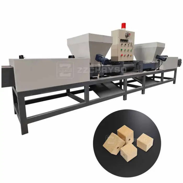 This machine compresses sawdust and wood shavings into high-density wood blocks used for wooden pallets, furniture components, eco-friendly packaging and other wood products.