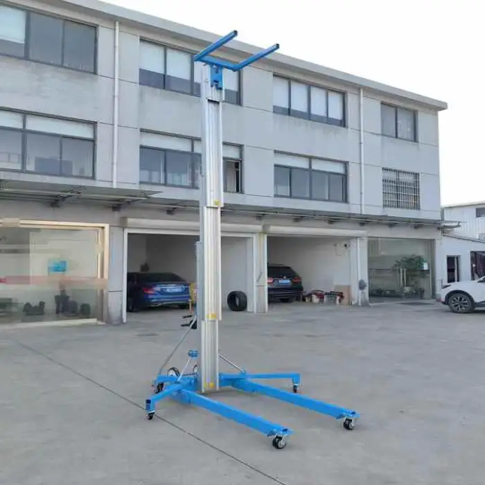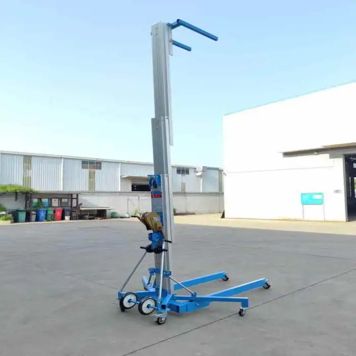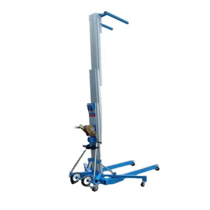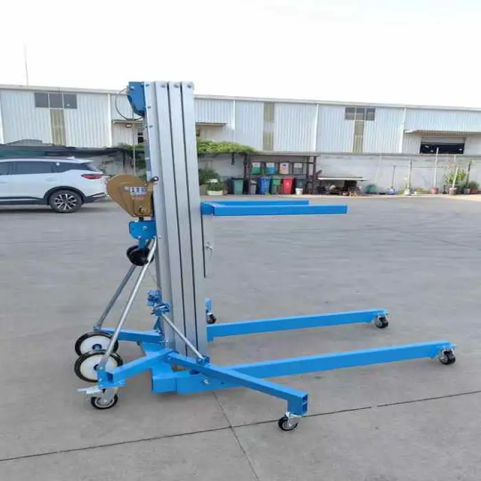 Key features include lightweight aluminum construction, manual operation, adjustable lifting height, and a strong load capacity.