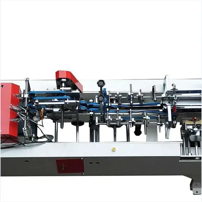 Key features include fully automatic operation, high gluing speed, durable design, straight folding support, and an automatic feeding system.