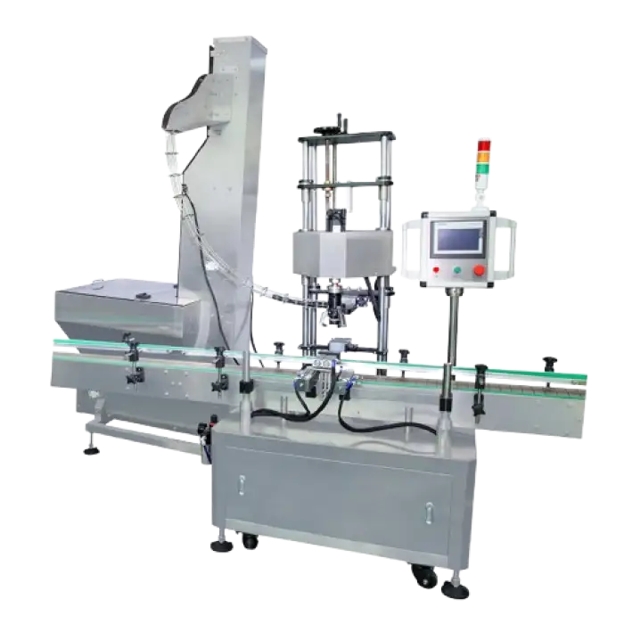 The pneumatic screw capping ensures consistent sealing through controlled air pressure, providing tight seals for each bottle.